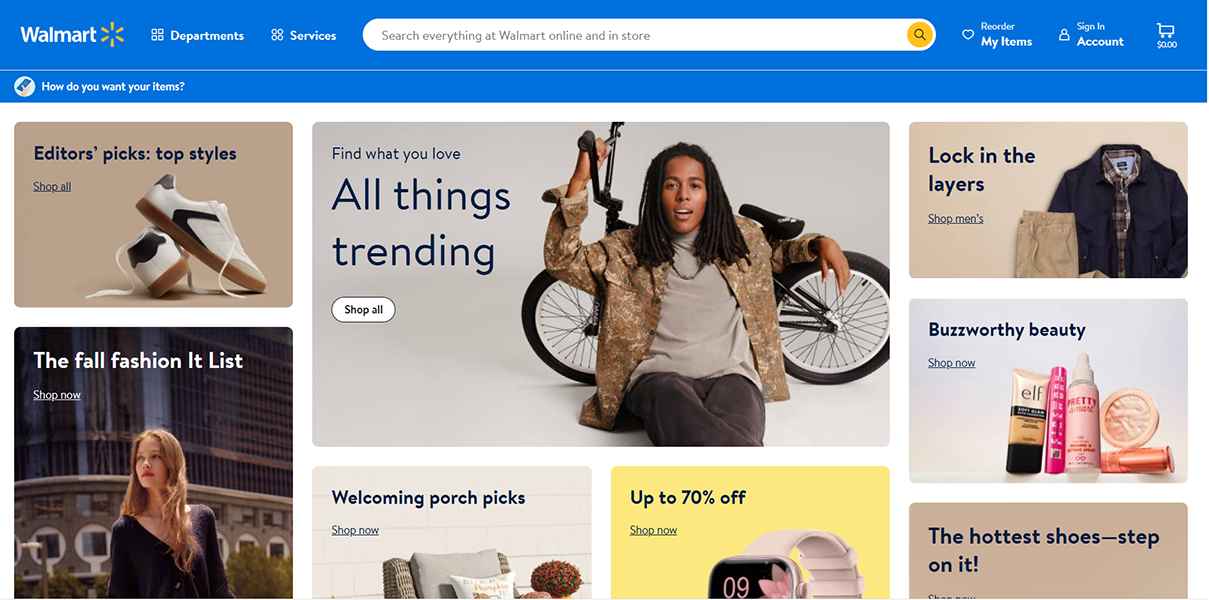 Walmart, a retail giant, extends its reach online with a wide array of goods, from groceries and household essentials to electronics and fashion. With competitive prices and convenient pickup and delivery options, it's a trusted source for everyday shopping.